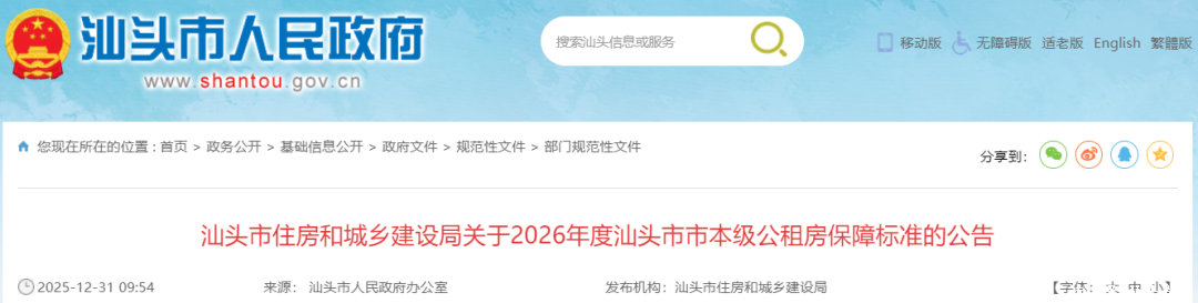 近日股票配资平台统计网站,汕头市人民政府官网发布《汕头市住房和城乡建设局关于2026年度汕头市市本级公租房保障标准的公告》。